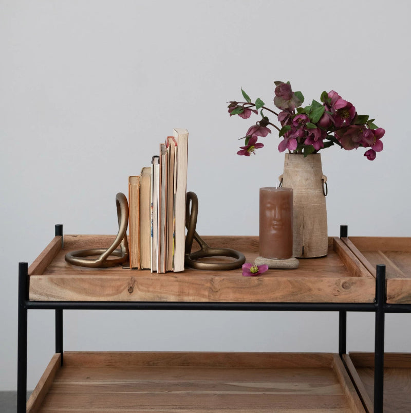 This set of 2 metal abstract bookends features an antique brass finish. A unique addition to any built-in, perfect for adding a touch of style to your bookshelf.