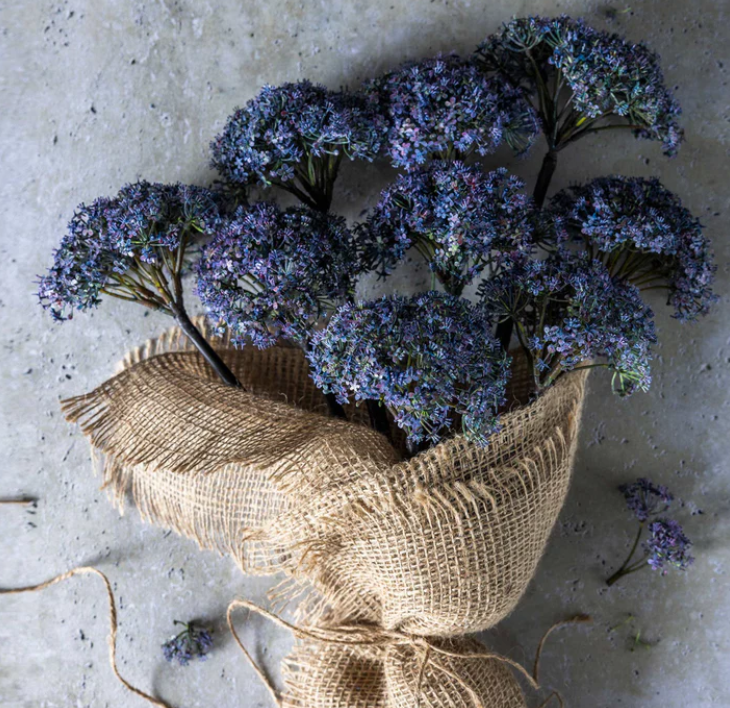 Topped with a deep, inky mauve hue, this artificial Trachelium stem brings rich texture and a bold statement to any floral arrangement. Its dramatic color and natural silhouette make it a standout accent for sophisticated spaces.