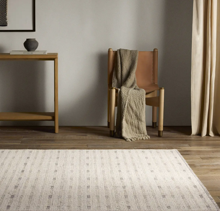 100% hand-looped wool yarns of cream and taupe artfully mingle with shades of weathered gray and green. Laisse faire stripes encourage the eye to travel the faintly global inspired, hand-tufted construction.