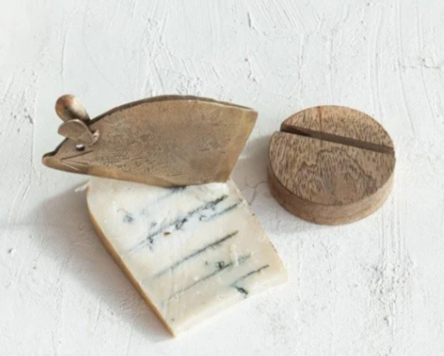 4"L x 2-1/4"W Hand-Forged Metal Mouse Shaped Cheese Knife w/ 2-1/2" Round Mango Wood Stand, Antique Brass Finish & Natural